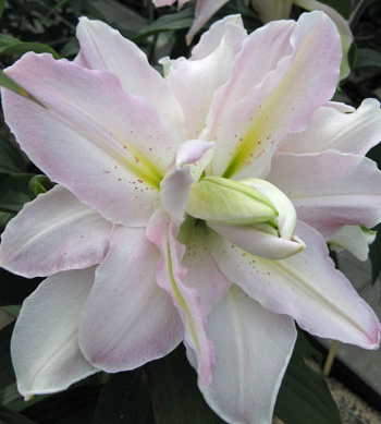 Лилия Double Ismael- восточный гибрид. Высота взрослого растения - 110 см. Цветок белый с нежно-розовым краем и желтоватой полосой по центру, махровый, очень крупный. Диаметр цветка - 25 см.